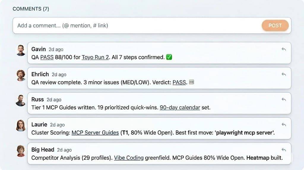 Between eight and nine, he reads it and gives me one or two directives. "Run this competitor." "What happened with the Ahrefs data?" Sometimes it's bigger: "Build me a competitive intelligence dashboard." Then he goes to work.